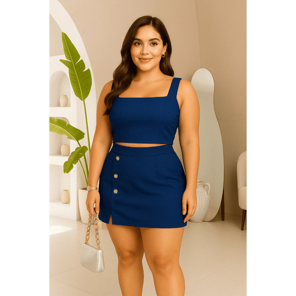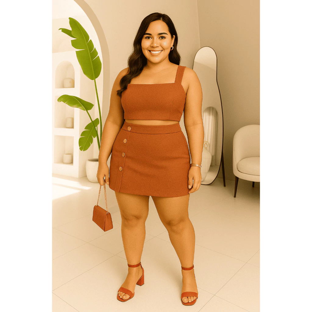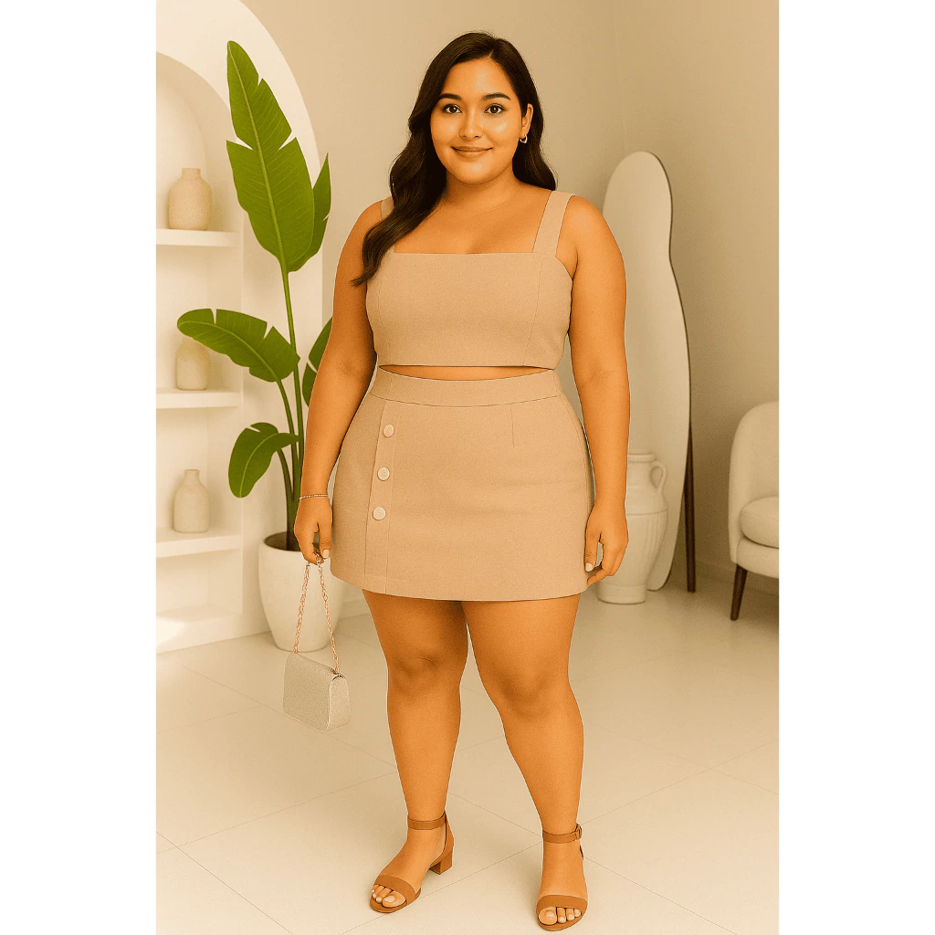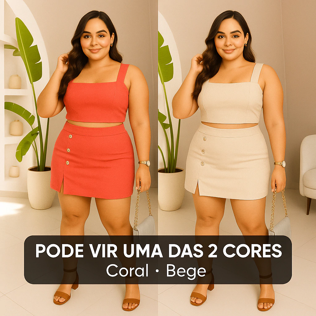 Conjunto Feminino Plus Size G GG G1 G2 | Cropped e Short Saia com Botões | Estica, Conforta e Valoriza(Nude,G2 (52 ao 54))