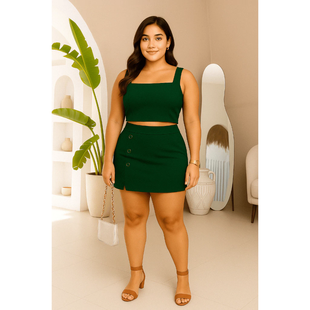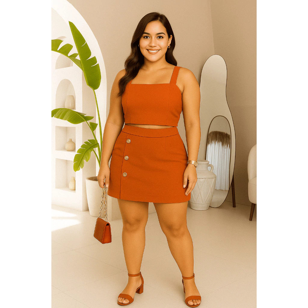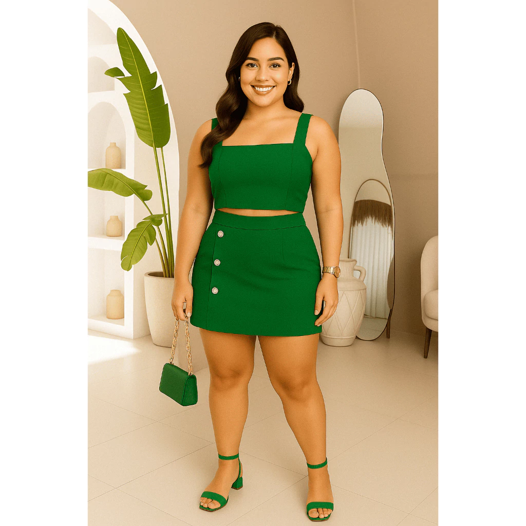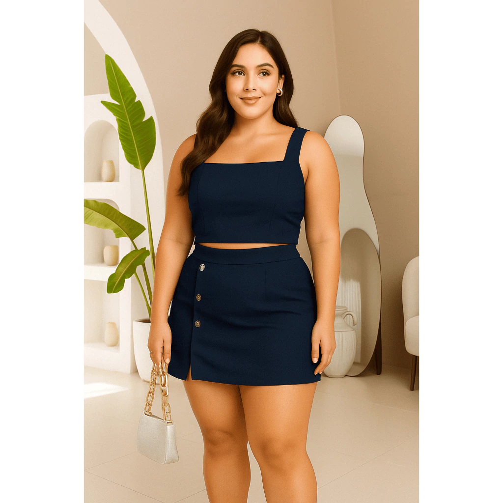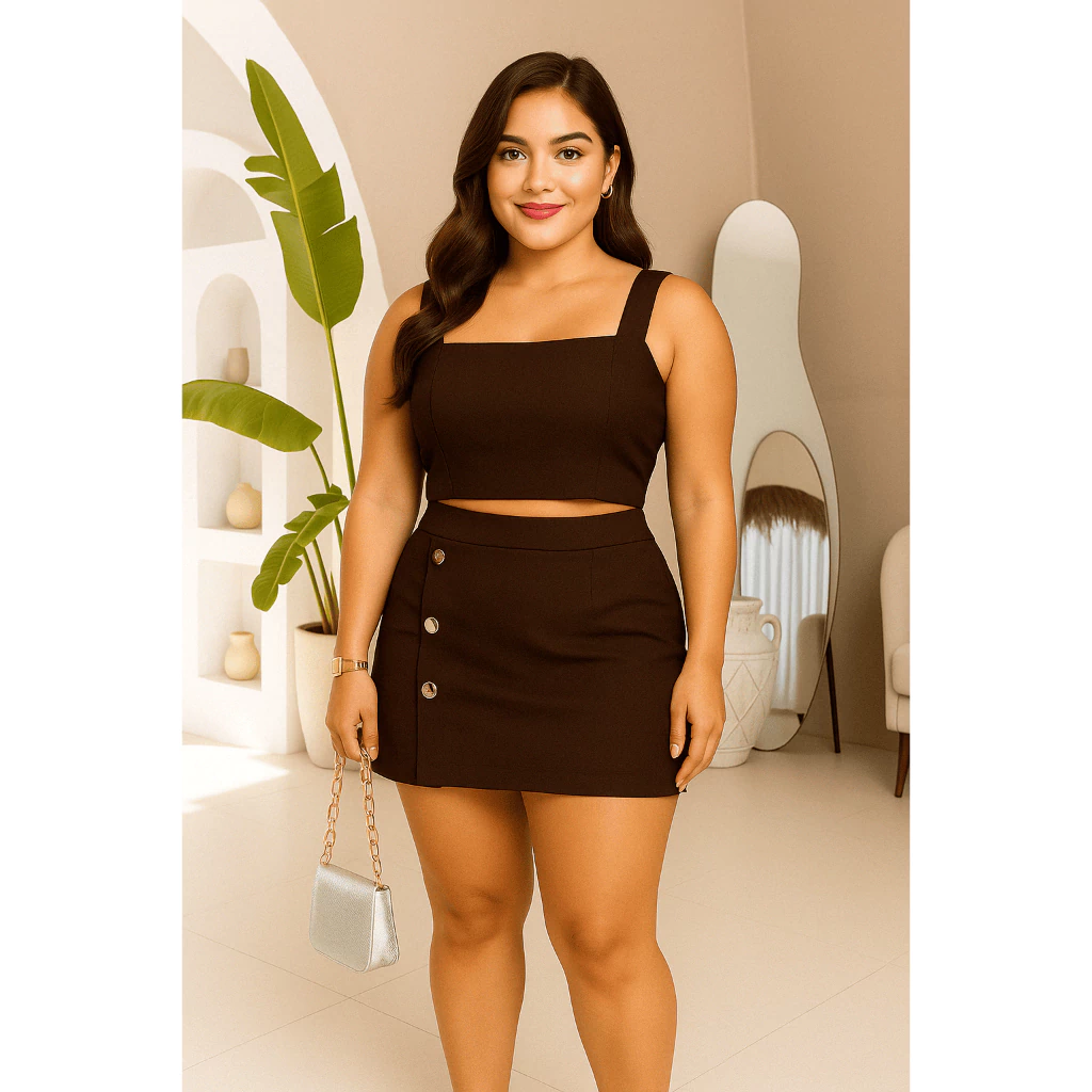 Conjunto Feminino Plus Size G GG G1 G2 | Cropped e Short Saia com Botões | Estica, Conforta e Valoriza(Nude,G2 (52 ao 54))