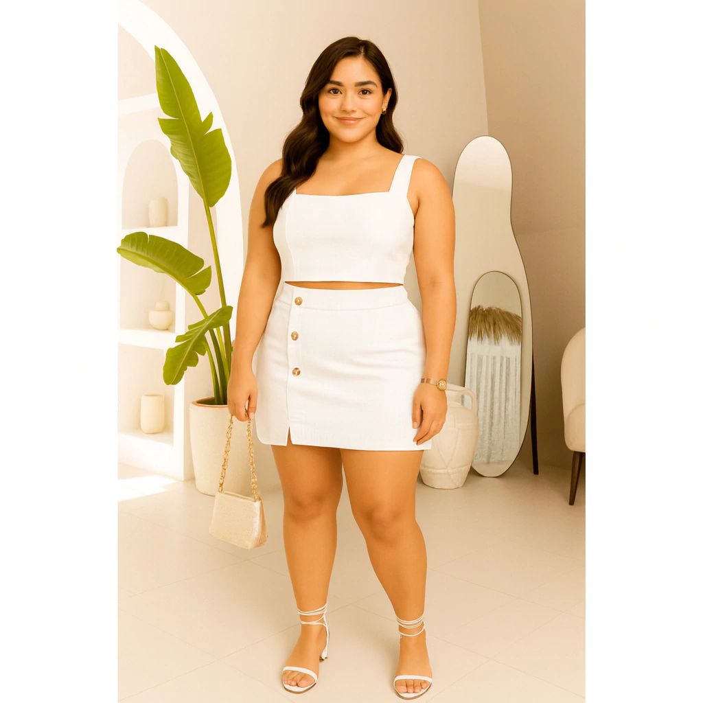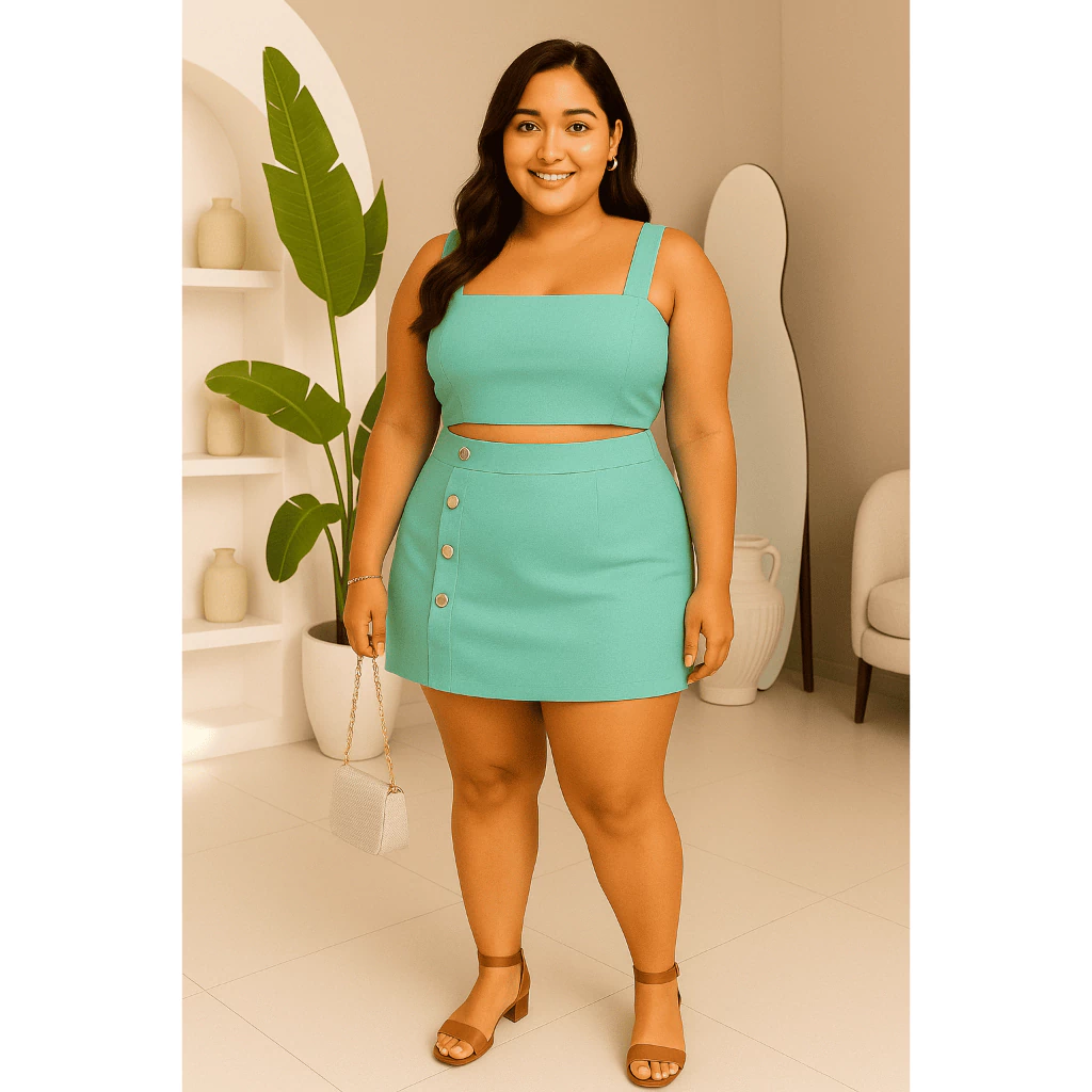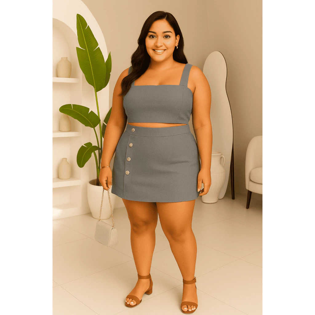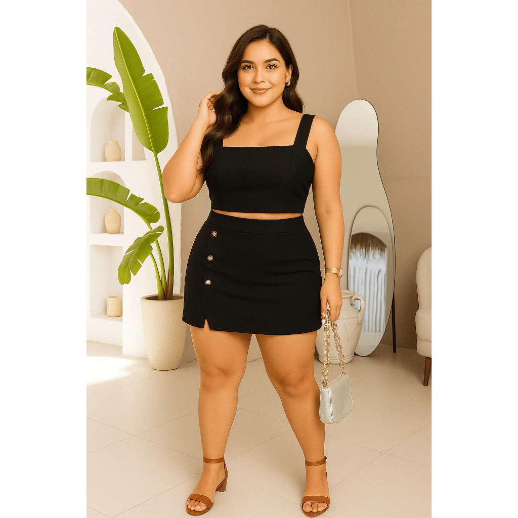 Conjunto Feminino Plus Size G GG G1 G2 | Cropped e Short Saia com Botões | Estica, Conforta e Valoriza(Nude,G2 (52 ao 54))